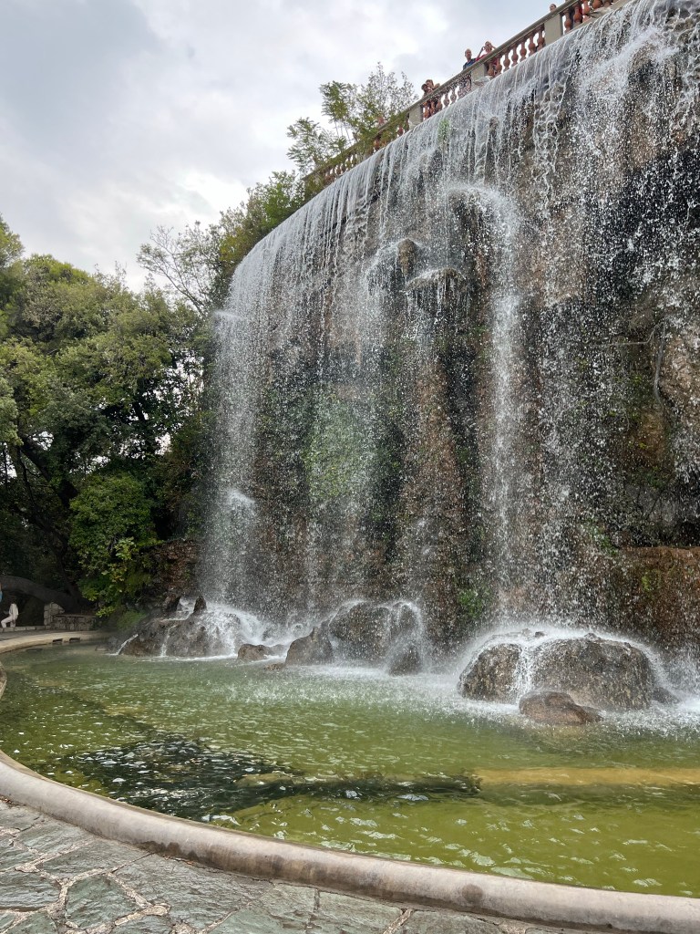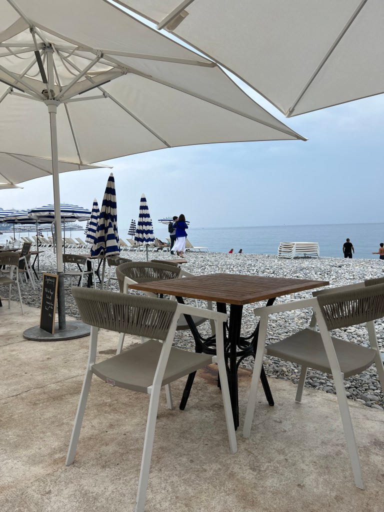 We made our way to the waterfront and enjoyed the views. The weather was a little overcast, but it made for great lighting for pictures. We took a bunch! We walked along the waterfront and up the coast, and we turned around to see the beautiful coastline of Nice. There was a big staircase that we walked up, which took us to a waterfall hidden in the mountain. After we came down from the waterfall, we found a restaurant on the beach where we sat and had drinks and snacks.