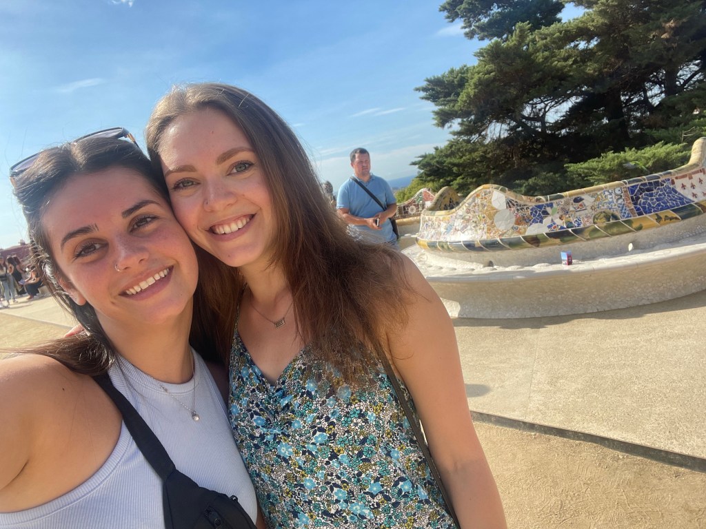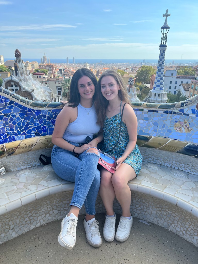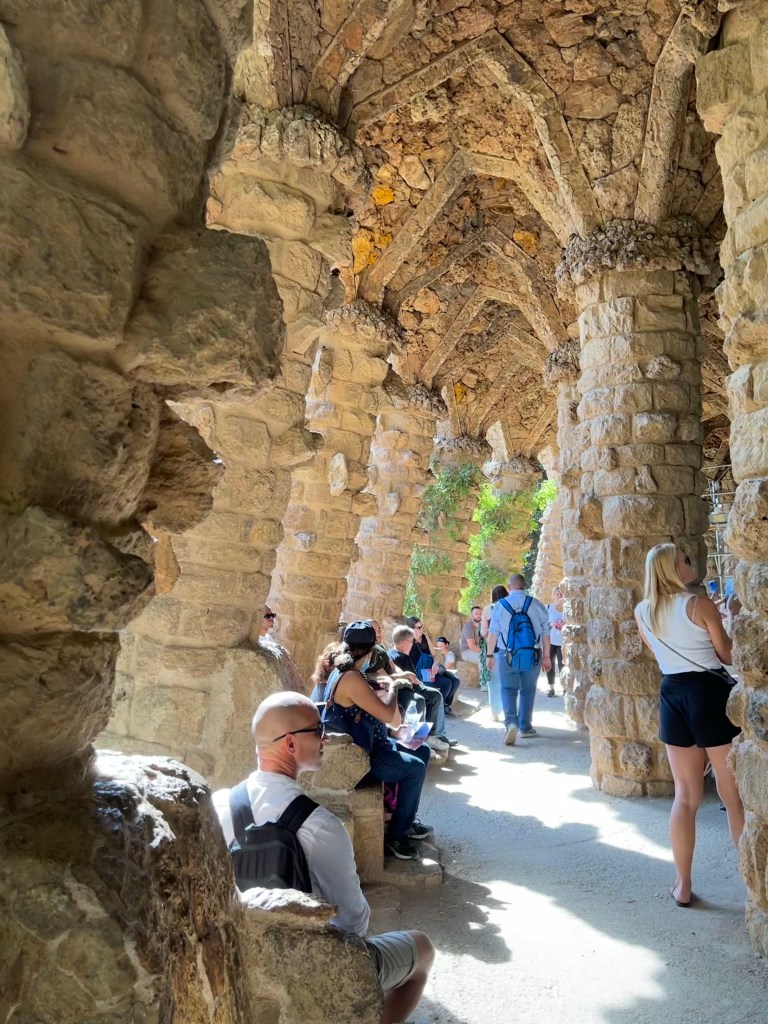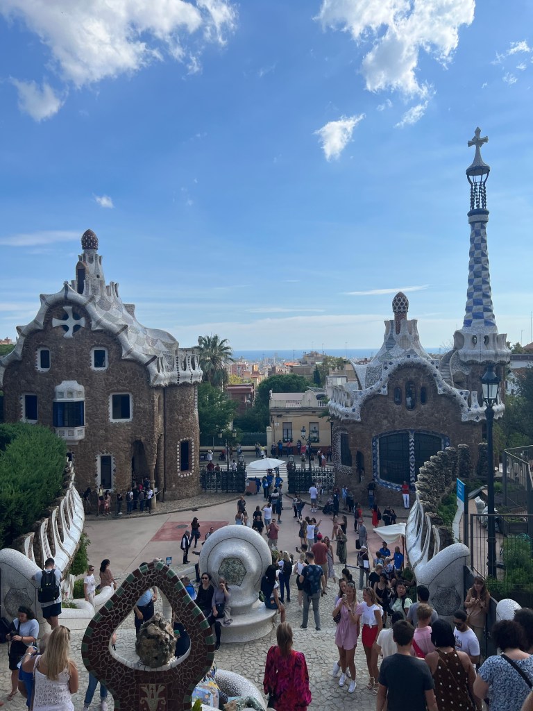 Jackie and Winnie left to go back to the U.S. today, so it was just Mallory, Carson, Kristina, and I left. The main thing on our agenda today was to go to Park Guell. We planned to have another picnic lunch in the park, so we took the metro to a nearby stop and picked up cava and flatbread pizzas. When we got to the park, there was a long line and tickets weren’t available until 2:00pm. So we found a bench nearby to sit and eat while we waited.