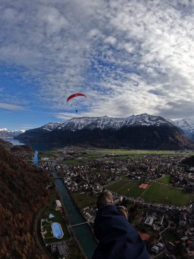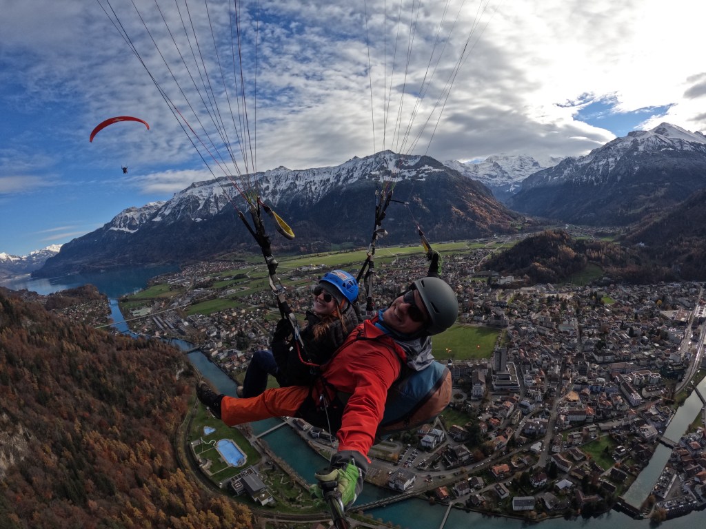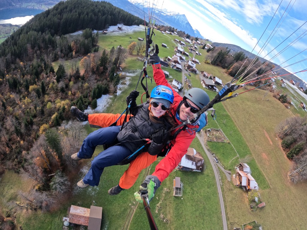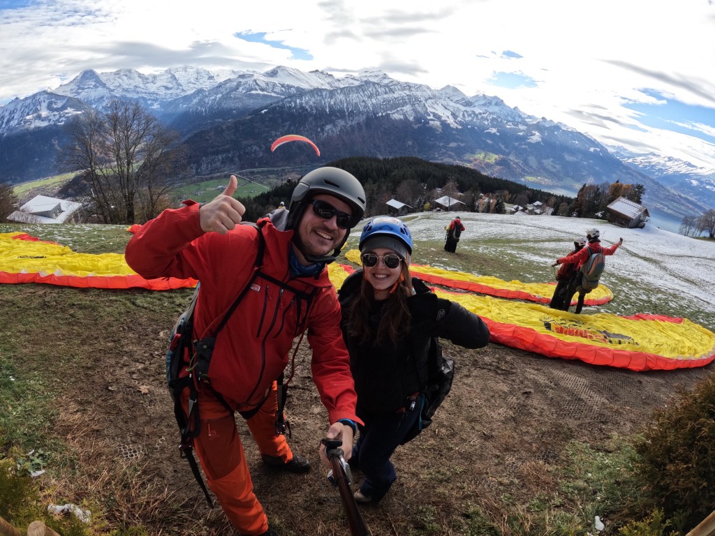 Matthijs had a camera on a selfie stick so he was taking pictures and videos the whole flight. He even left me use the handles to steer us for a little bit! Most of the flight, though, I was able to sit back, relax, and enjoy the view. I already knew Interlaken was beautiful, but WOW! From up above, it is truly stunning. It was a gorgeous day, and the lakes and rivers down below were so bright. The lakes in Interlaken are the most amazing blue; the coloring comes from the glacial water. It was just incredible. As we flew, Matthijs and I chatted and he took a ton of pictures for me. At the end of our flight, we did a little “roller coaster”, meaning we basically spun in circles really quickly. It felt like we were doing donuts! It was so much fun. We were probably in the air for 15 minutes. It felt so quick, and the second we were back on the ground Mal and I both wanted to go up again! We were both so glad we were able to fit this into our trip. It was definitely a highlight of Switzerland for me.