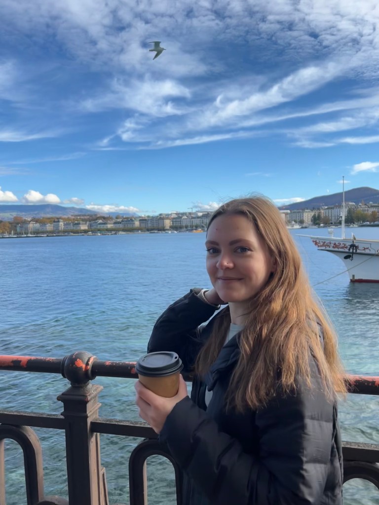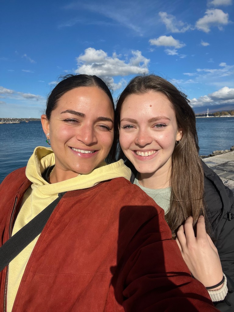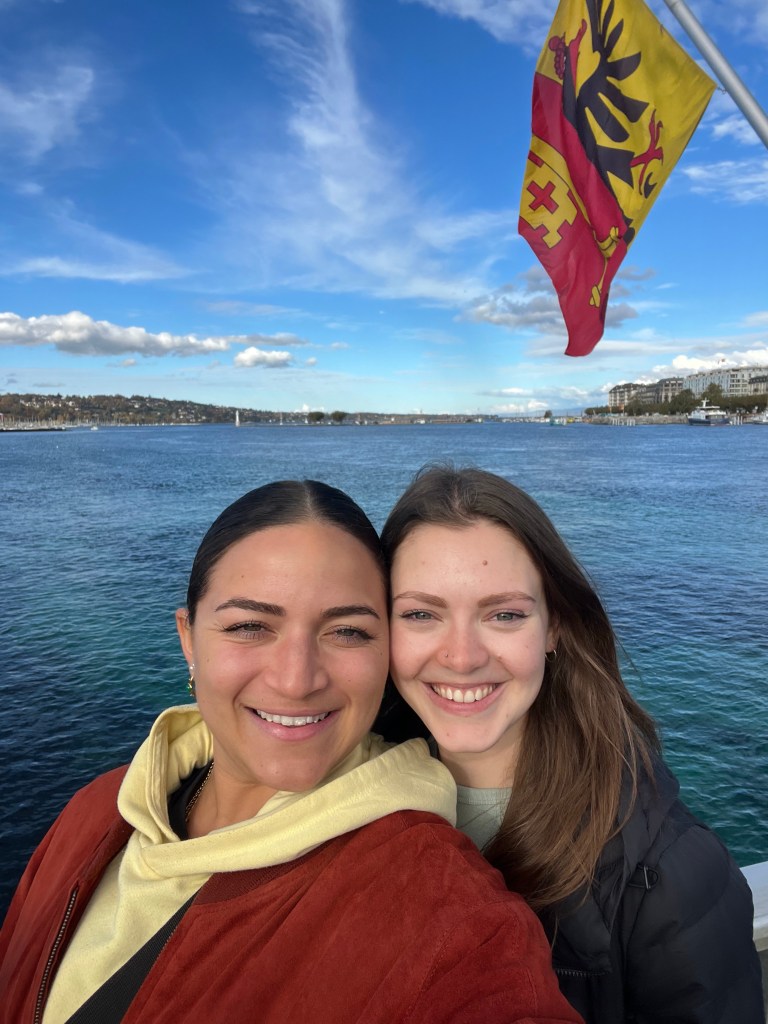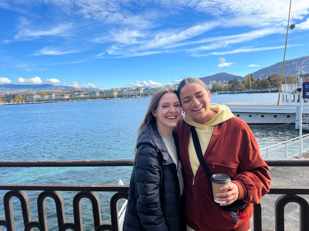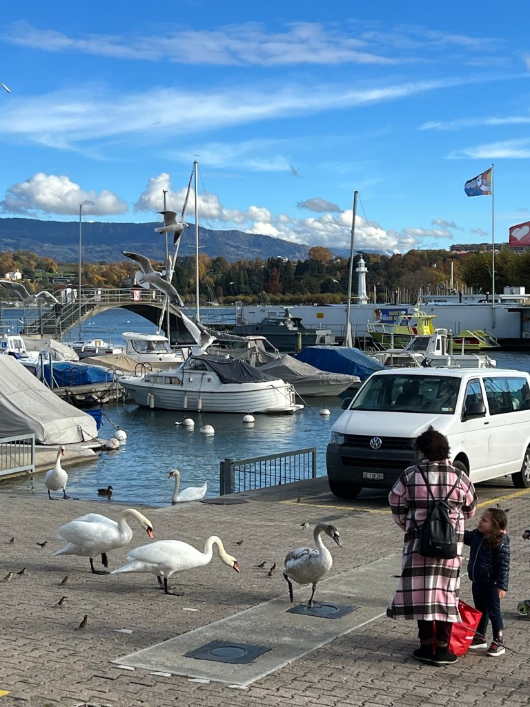 In desperate need of a bathroom break, we stopped into a cafe to grab a warm cup of something (hot chocolate for me; chai latte for Mal) to take with us as we continued walking around the city. We crossed the bridge to the other side of Lake Geneva and walked along the lakefront. Despite being mid-November, the fall colors were still so bright and beautiful. We loved seeing all the different colored trees in the hills across the lake. We watched swans diving in the lake and took some pictures. We walked to a pier that is home to Bains des Paquis, a public bath house & sauna. Even though it was in the mid-50s, there were still a ton of people braving the cold, jumping off the pier, and swimming in Lake Geneva. It was a beautiful spot, and I can imagine that if I visited or lived in Geneva in the summertime, I would spend 90% of my time on that pier with a book.