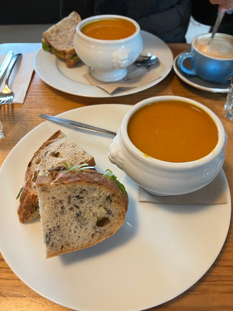By then, it was 2:30 pm, and we were both starving. We sat outside and got lunch at a cafe that we had passed on our walk to and from the cable car. Despite the cold and the elevation, it was so nice to sit outside. We were bundled up and the sun was really warm on our backs. Mal and I split a spinach soup, cheese and tomato panini, and an open-face mushroom sauce sandwich. It was all so good, and the view simply couldn’t be beat!