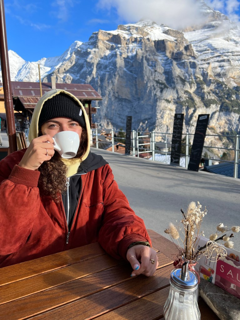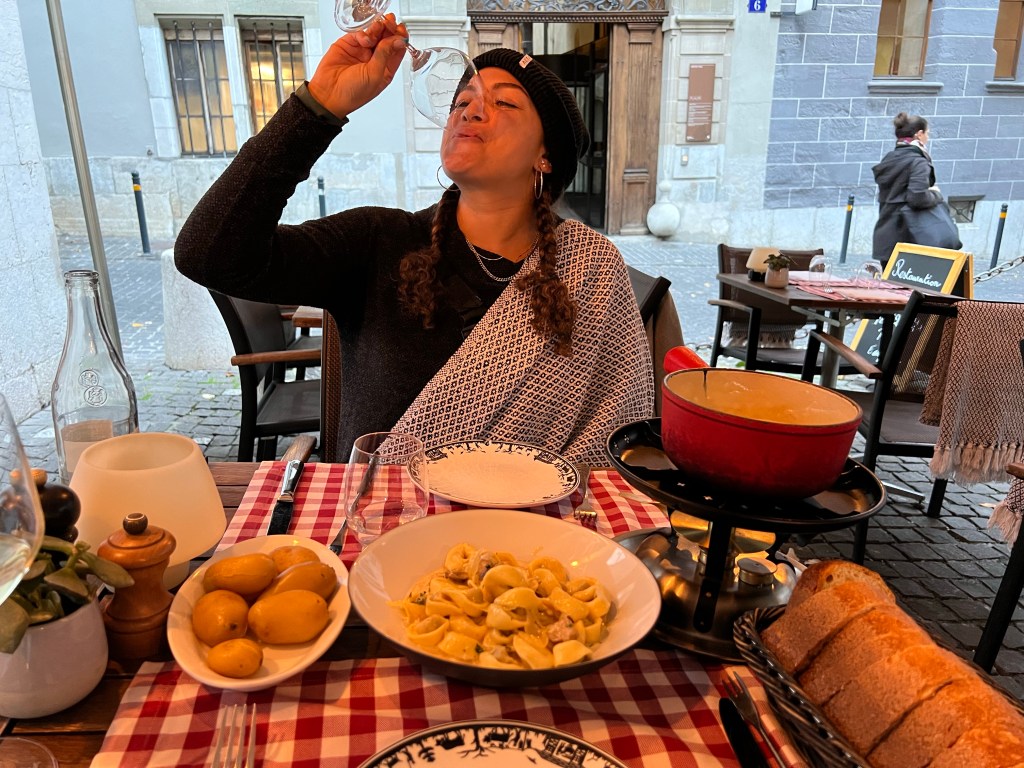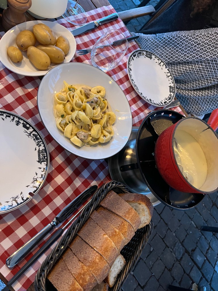 When in Switzerland, you must have fondue! We made reservations for a highly recommended restaurant called Restaurant Les Armures. We sat outside, and coincidentally, it was right next to one of the places we had passed in our VR experience. We shared a cheese and mushroom fondue and a mushroom tagliatelle. We both got a glass of white wine as well. The outdoor tables had blankets at each chair, so we both snuggled up with a warm blanket as we enjoyed dipping our potatoes and bread in the gooey fondue while we talked for hours. It was a perfect Swiss meal.