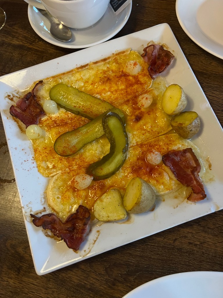 Once the rainbow had faded, we decided to take the bus back into town to get some dinner. Although we stopped and had a photo shoot on our way. Once we made it to dinner, we got a magherita pizza and raclette, which is a Swiss dish of melted cheese served with potatoes, pickles, mini onions, and bacon. We stopped by the grocery store to pick up some food to keep in the fridge and then headed back to the apartment where we watched Survivor before going to bed.