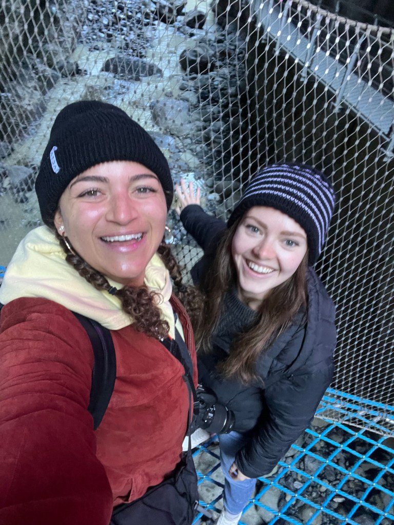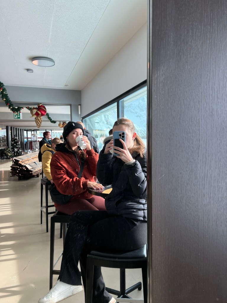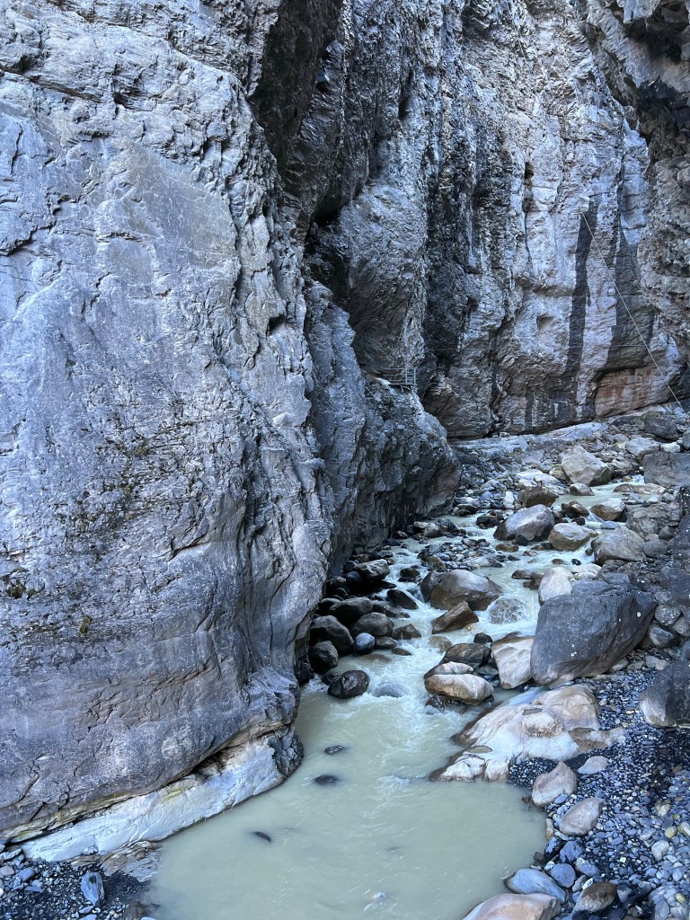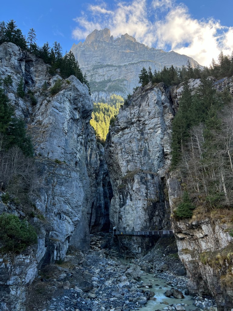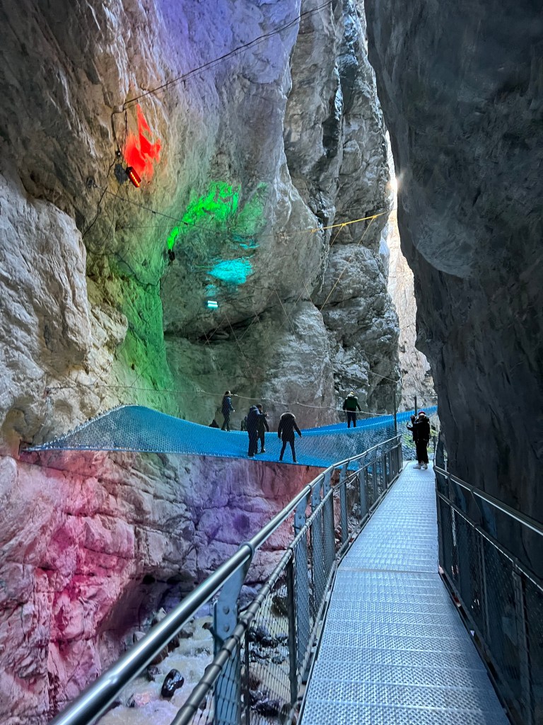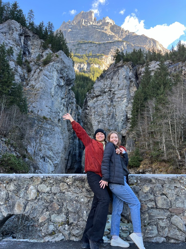 Instead, we went to the glacier canyon. We got to walk on a platform through the canyon and admire the incredible glaciers and the running stream below. There was a part of the canyon where a rope web had been strung over the canyon. You could walk on it and stand directly above the canyon. They had some colorful lights there. They even do light shows at night. We also saw people who were at the top of the canyon hooked to cables jump off and swing through the canyon! That was a lot of fun to watch. We ran into a couple that we had met while skiing the day before. They had just done the canyon swing and said it was amazing! We also had a lot of fun setting up Mallory’s tripod and taking pictures and silly videos with the gorgeous view in the background. We walked back through Grindelwald to the train station, admired the amazing views along the way, and headed back to Iseltwald.