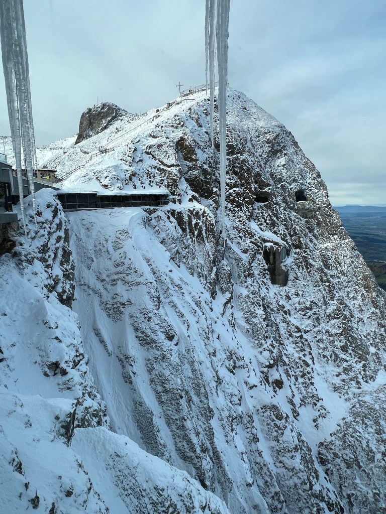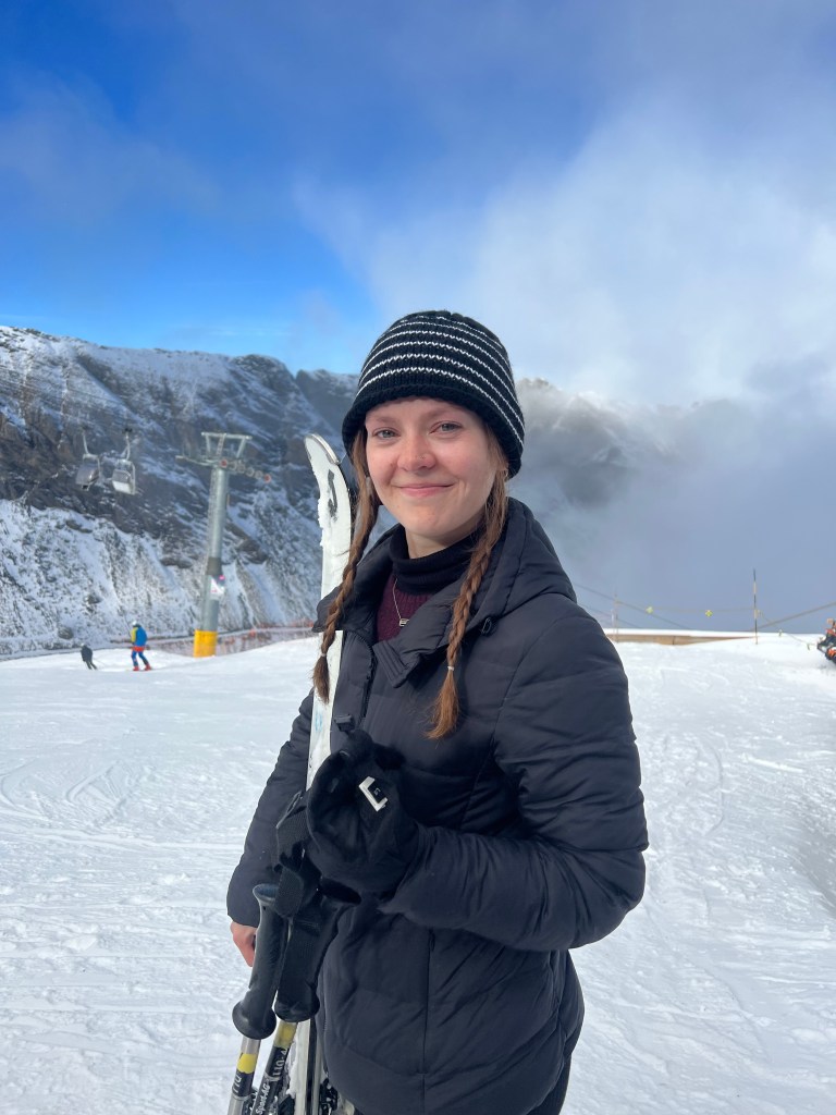 Finally finding this sports shop was so relieving. When we told the owner that we wanted to rent skis, he looked at us a bit apprehensively and said, “Okay, but do you know how cold it is up there?” Neither of us had snow pants, snow-proof coats, or gloves. I didn’t even have a hat. In addition to renting the skis, we also both got gloves and I got a hat. We trekked through town in our ski boots and took another cable car up to the slope.