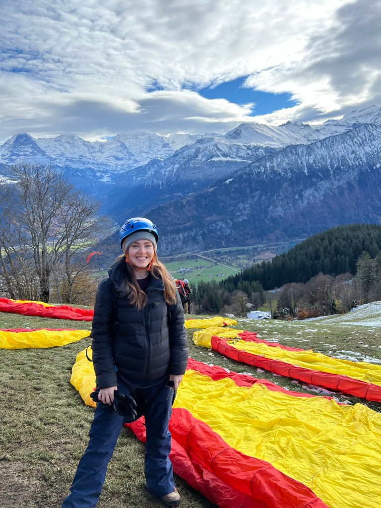 We were going paragliding! All week we had been seeing people paragliding over this region of Switzerland, and we were dying to try it too. We got suited up in snow pants and hiking boots. There were seven people in our group, and we all got in a van to pick up our pilots by the big field in town where they had just completed their last flight. The pilots joined us in the van and talked us through the whole process as we drove 20 minutes up the mountain. When we got out of the van, we paired up with our pilot. I flew with a guy named Matthijs. He is Dutch and was so friendly! I was a little nervous, more so for the take off portion of the flight, but Matthijs really calmed my nerves. He also used to be a teacher, but he fell in love with paragliding and now does it for a living!