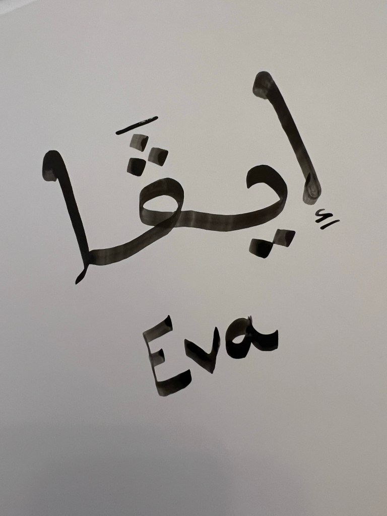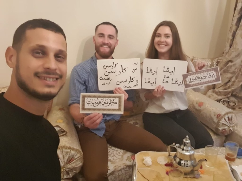 After all that we had learned about Arabic calligraphy, we were ready to try it ourselves! We watched Abderriham demonstrate writing each of our names, and then took a crack at it ourselves. Arabic is read right to left, so we felt like we were writing backwards. We also learned that Arabic can technically be written without vowels and still be understood. The points that are added above or below letters dictate the specific sound that letter makes. Carson and I spent a ton of time practicing writing our names over and over again. Abderriham was so nice and said that he was really impressed with us both! I was very proud of myself. Once I got in the groove, I just wanted to keep writing my name again and again. It was so fun! At the end of the class, Abderriham wrote both of our full names on a decorative name plate. He used a different font than what we had practiced, so it is more decorative. It’s cool to compare his version of my name with what I had been practicing. Even though they don’t look identical, I can now see the similarities and be able to identify where it says “Eva”.