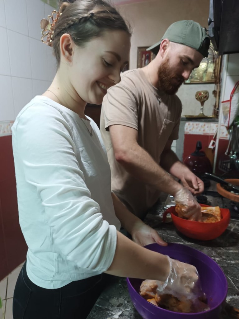 By now, Inas’s mom and dad were home. Inas’s mom was supposed to help teach the class with her, but she had had to go to the hospital the day before and wasn’t able to make it. She had been really bummed and even asked if we could reschedule the class so she could be there, but this was our last day in Casablanca. Luckily, she was able to come home in time to see us! She didn’t speak English, but she was the most enthusiastic person I have ever met! She greeted us both with the tightest hugs and turned up the music and danced! While Inas started setting the table, Carson and I hung out with her mom and dad. They pulled up YouTube videos on the TV of their favorite Moroccan songs and we had a big dance party!