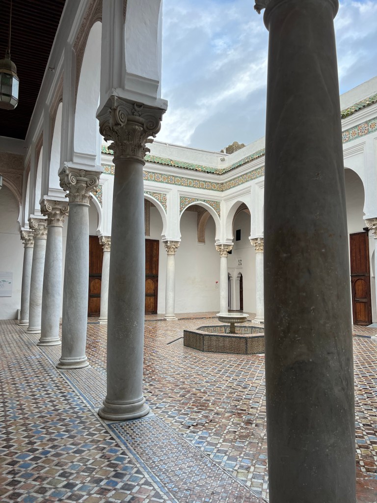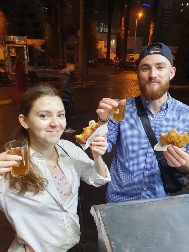 During the class, Abderriham had asked us if we had been to a certain part of the city yet. When we said that we hadn’t, he offered to take us there when we were done with class. We got to experience a shared taxi ride, which was really fun. It functions like half-taxi, half-bus. It’s a taxi cab, but there were seven people squished inside each with a different destination. Abdherriham walked us around the Old Medina, the markets, and near the Royal Palace. He showed us some of his favorite spots and treated us to some drinks and snacks. Carson had casually asked what the best street food was in Casablanca. Abderriham had said it was a donut, so we said we would have to try it later! Little did we know that he led us to the complete other side of town just to take us to the best donut stand in the city. He got us each one of the donuts, which had lots of crispy layers like a croissant with a jelly filling, and Moroccan tea. We hadn’t even been asking him to do that, but he was so kind to take us there regardless. We also tried some fruit juice from a nearby fruit stand before parting ways with Abderriham. Carson and I were so overwhelmed by Abderriham’s kindness and generosity! He had spent six hours hosting us and giving us a tour of the city!