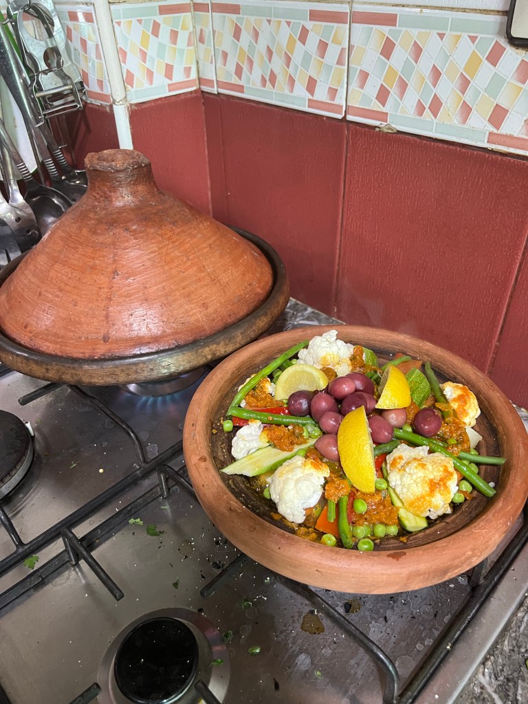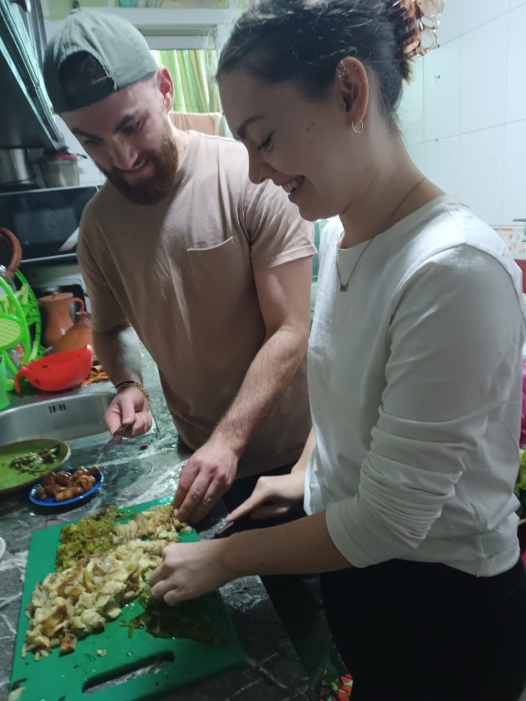 Once we got back to Inas’s house, the real work began. Mohamed had to leave, but before he left he put on some traditional Moroccan music for us to listen to as we cooked. Considering how much food we got at the market, I should have predicted this… but we cooked for SO LONG. We were chopping and peeling for over three hours. Carson and I were both exhausted, and neither of us had eaten breakfast so we were starving. The class was listed on Airbnb as 9:00 am-12:00 pm. We didn’t even get back from the market until 12:00 pm… so we knew that we would be there for quite some time. (We learned throughout our trip that “Moroccan time”, as we came to call it, is very relaxed) The only problem was that Carson had work that day at 3:00 pm, which was why we had signed up for the morning time. We should have told Inas this from the beginning, but even with “Moroccan time” taken into consideration, we didn’t expect to be there long enough for it to be a problem anyway. So we chopped, peeled, mixed, and seasoned from 12:00-3:00pm. At 3:00pm, we were finally done chopping everything and just had to wait for the tagine to cook. Carson had slipped out to make a phone call to a coworker who could cover for him for a little while. When he came back, I asked Inas how long the tagine needed to cook. She replied, “one hour!”, and Carson and I gave each other a wide eyed look. At this point, we did end up telling Inas that Carson had work and that we would need to leave by 5:00 pm at the latest.