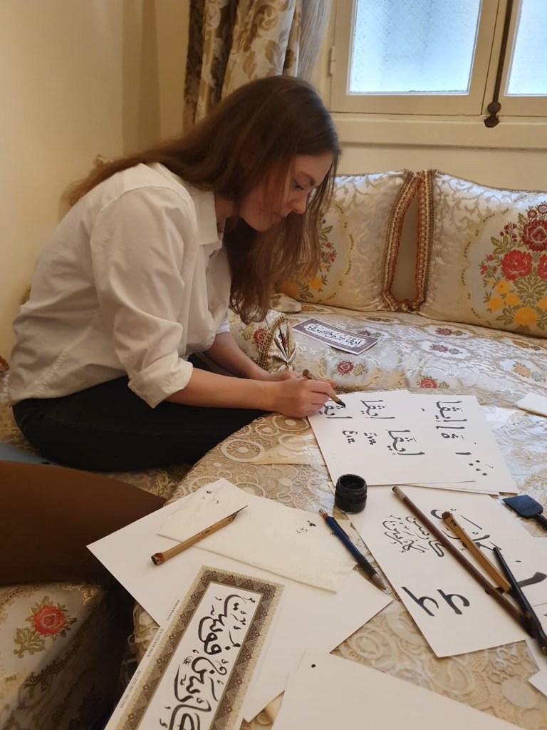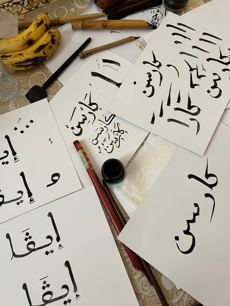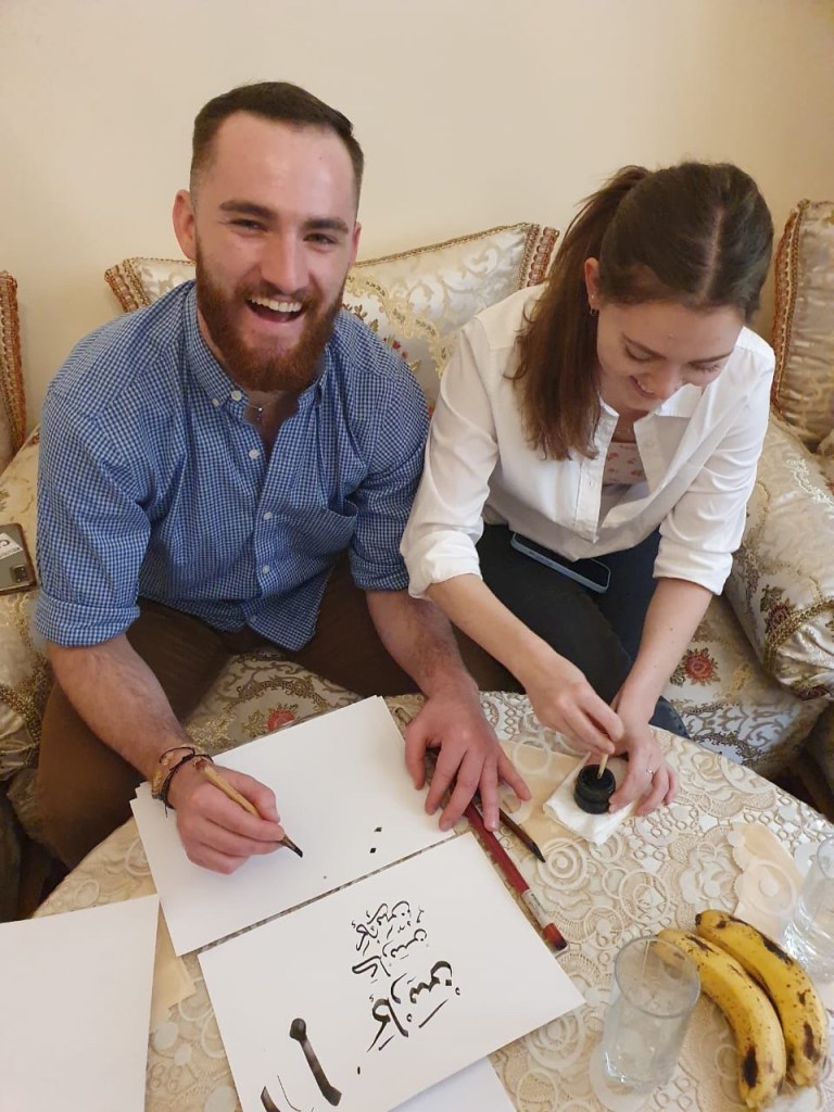 Once we were done with lunch, Abderriham pulled up a PowerPoint presentation to teach us all about Arabic calligraphy. He goes into schools to teach these same lessons to kids. We got to learn a lot about the history and evolution of Arabic calligraphy, and he showed us many examples of different fonts of Arabic and how it is truly an art. Something that stuck with both Carson and I was an analogy that Abderriham used by saying that Arabic is like water; it can take the shape of whatever container you put it in. He showed us a lot of examples of advertisements or works of art with Arabic writing that creates the shape of something unique like an ostrich. Carson and I had such a hard time wrapping our heads around all of this information since we can’t recognize all the letters individually, but we were amazed! We also got to learn a lot about the tools that are used, and it is truly incredible how everything has a meaning. The “pens” have an angled edge, and each point has a specific name to help make sure you are holding it correctly. The point that is closest to you is named “human” in Arabic because it is closest to you and your heart. The point that is farthest from you is named “monster” in Arabic because you want to keep the monsters away.