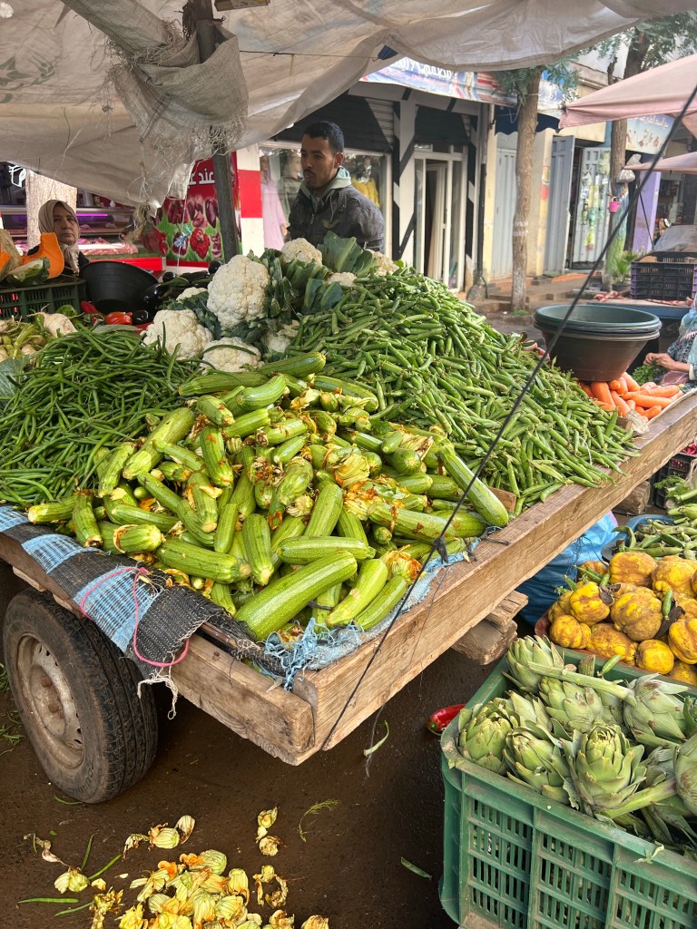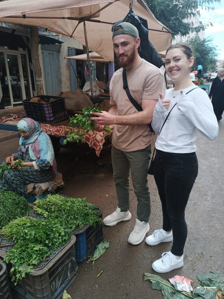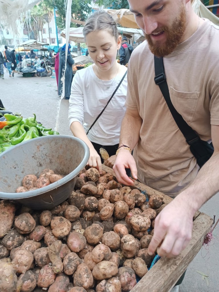 Then, we got to planning our meals for the day. We made tagine (a traditional dish cooked in a tagine pot with lots of vegetables and spices, plus chicken in Carson’s), zaalouk (a side dish made with barbecued eggplant and peppers and mixed with tomatoes, garlic, olive oil, and spices), taktouka (another side dish made with barbecued green peppers, tomatoes, garlic, olive oil, and spices), and Moroccan salad (tomatoes, onion, and parsley). We wrote a list of all the ingredients that we would need and walked 10 minutes down the road with Inas and Mohamed to the local souk (market). We got all of our ingredients fresh from local vendors, and I swear we bought enough food to feed a village. You could only buy the produce in quantities of 1 kilogram, so we ended up with so much of each ingredient. Each stand gave us a small plastic bin that we used to collect our handpicked vegetables. After our food was weighed, Inas taught us how to say “thank you” so we could pay the vendors ourselves. I was so amazed at the prices of this food. For some of the ingredients, we bought a whole kilogram for 5 Moroccan Dirham, which is about $0.50 USD.