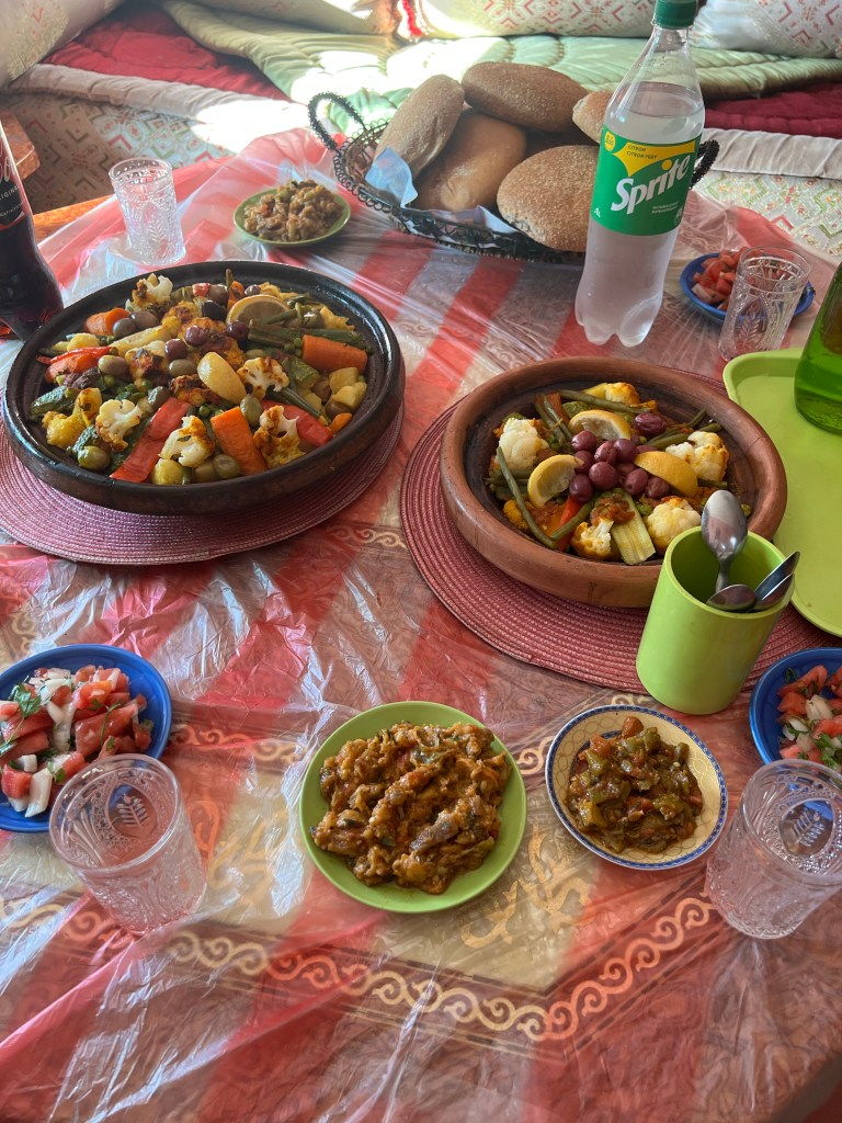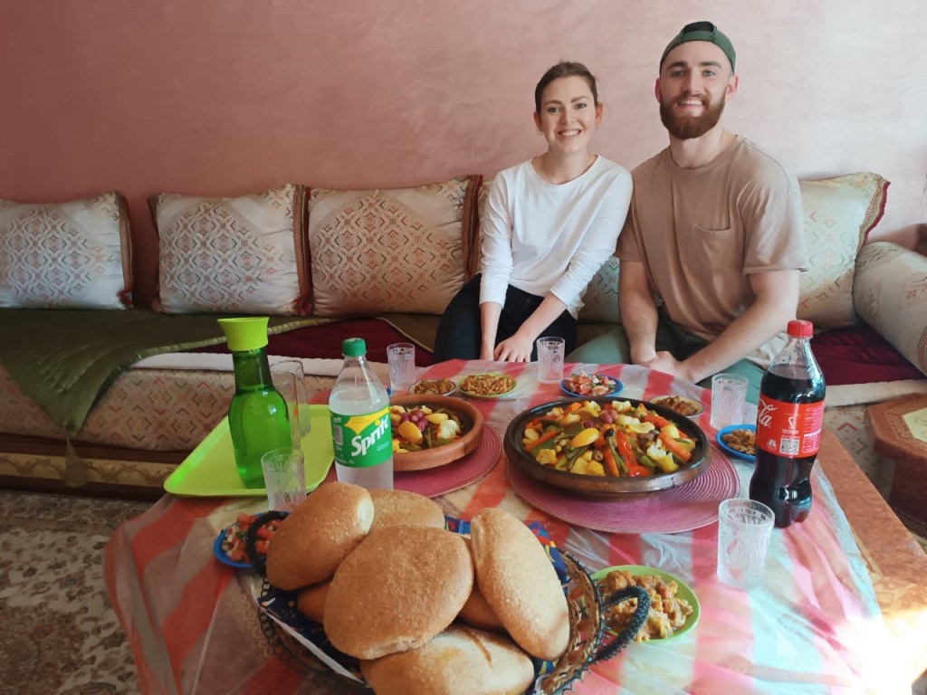The thing we were most looking forward to today was an activity that we booked through Airbnb. We took an Arabic calligraphy class! Our teacher Abderriham was kind enough to meet us at our lunch spot and get an Uber with us back to his house where we would be having class. We were kind of far away, so it was really nice of him to go out of his way to come get us. When we arrived at Abderriham’s house, he told us that we would start off by having lunch! Of course, Carson and I had literally just eaten lunch… but we didn’t want to be rude! Abderriham’s mom had made couscous and vegetables. It was delicious, but wow, we were stuffed!! It was nice to eat a homemade Moroccan lunch and get to know Abderriham before starting the calligraphy lesson.
