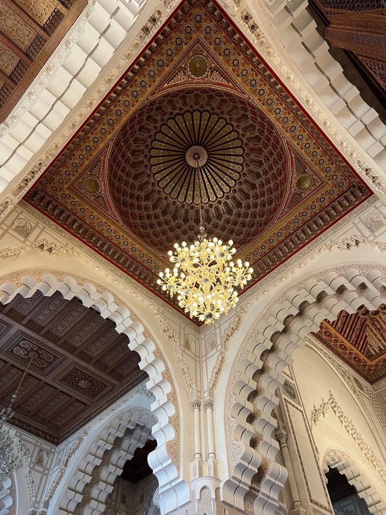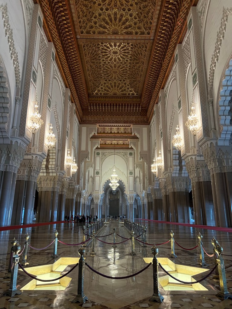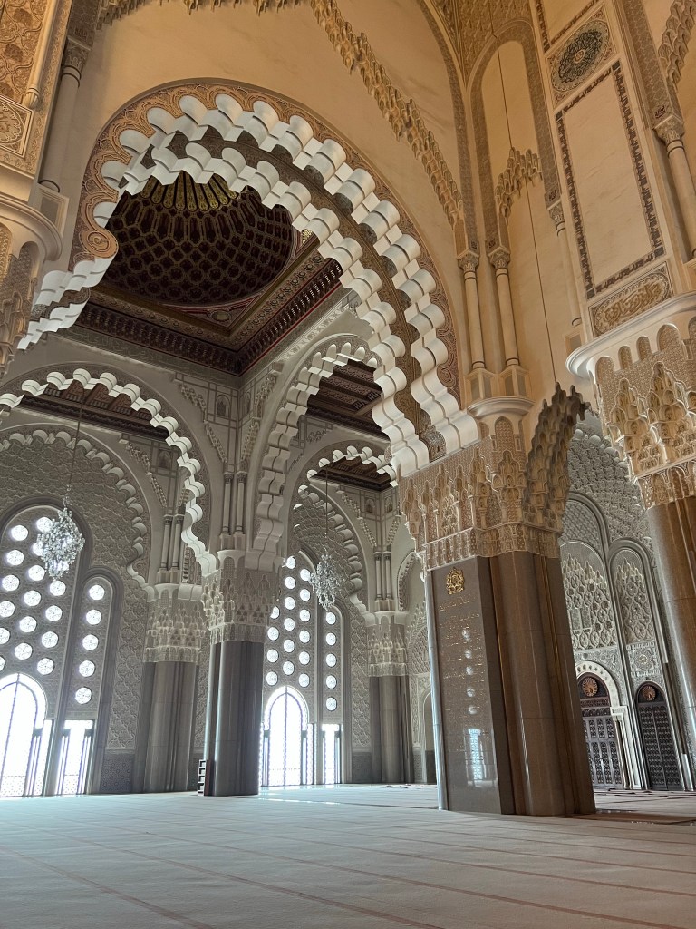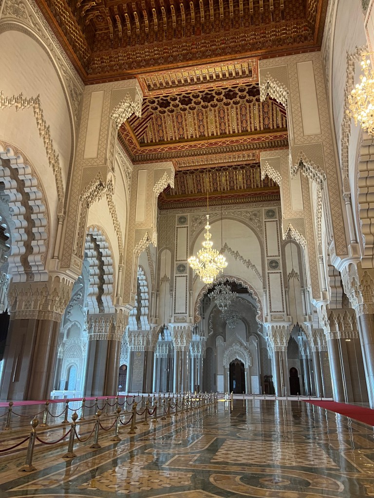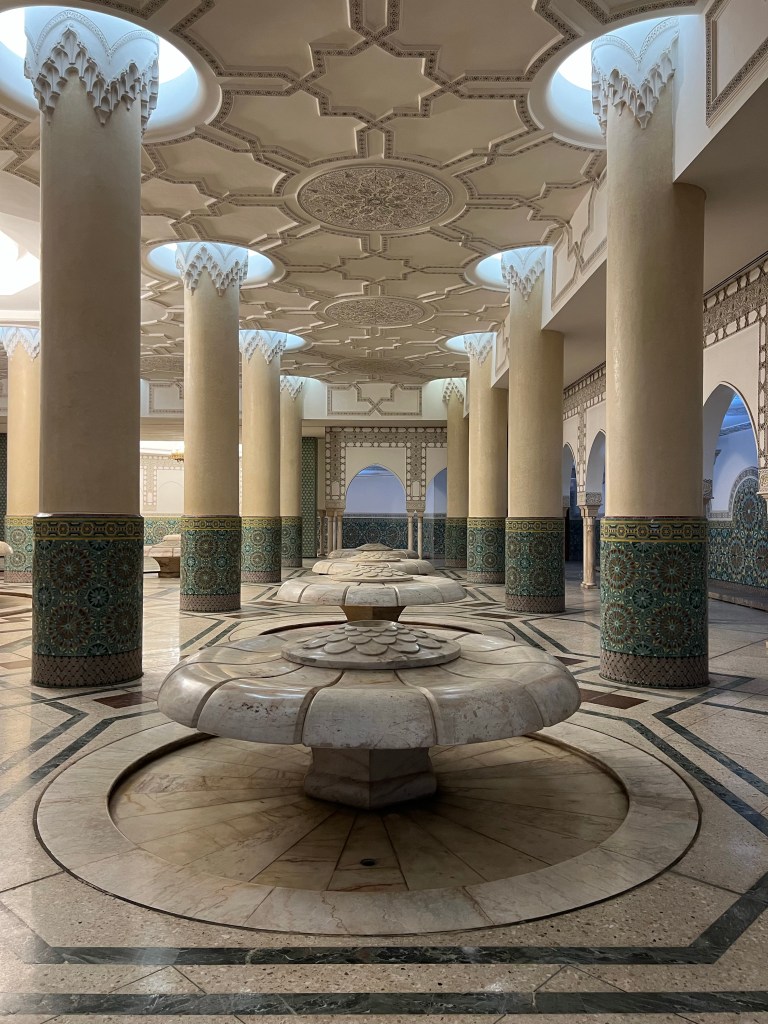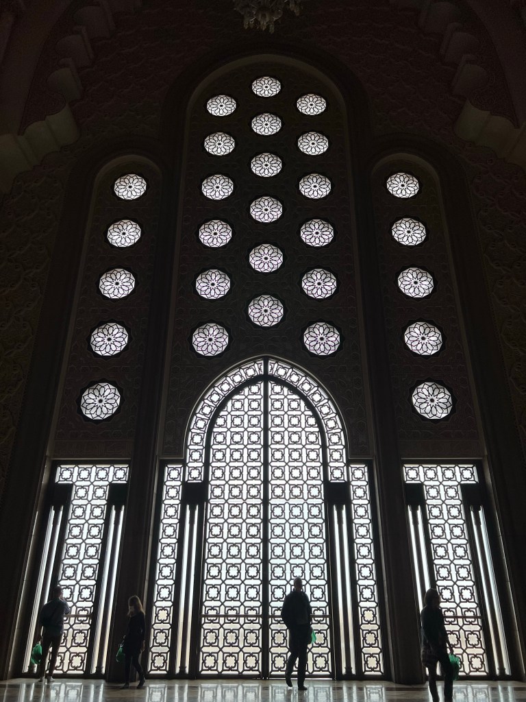 We spent the morning at the Hassan II Mosque, which is one of the few mosques in Morocco that allows non-Muslim visitors. I’m so glad we were able to go on a guided tour of the mosque and learn all about it. The mosque is fairly new; construction started in 1987 and was finished in 1993. It is MASSIVE inside. When people come to the mosque for prayer, the inside can house 20,000 people, and the outdoor area can hold 80,000. My favorite part of the mosque was the ceiling, which can be opened like a skylight. It was closed while we were there, but it is opened regularly during the summer for ventilation. Since the mosque is so new, it is technologically advanced in a lot of ways. The ceiling can be opened at the touch of a button, and it only takes two minutes despite its massive size and weight. There are also speakers built into mosque and hidden within the decor. The center aisle of the mosque is sectioned off because it is the path taken by the King when he visits the mosque. There is an area in the center of the mosque along the King’s path that has glass windows on the floor surrounding it. You can look through the windows and see into the downstairs area where people wash themselves before prayer. When the King comes to visit, these little glass windows, which are about a foot deep, are filled with water. Our guide said that when they are filled with water and the ceiling is open, the sunshine reflecting on the water makes it look like the ocean and as if the King is walking on water. I can only imagine how magical that looks!