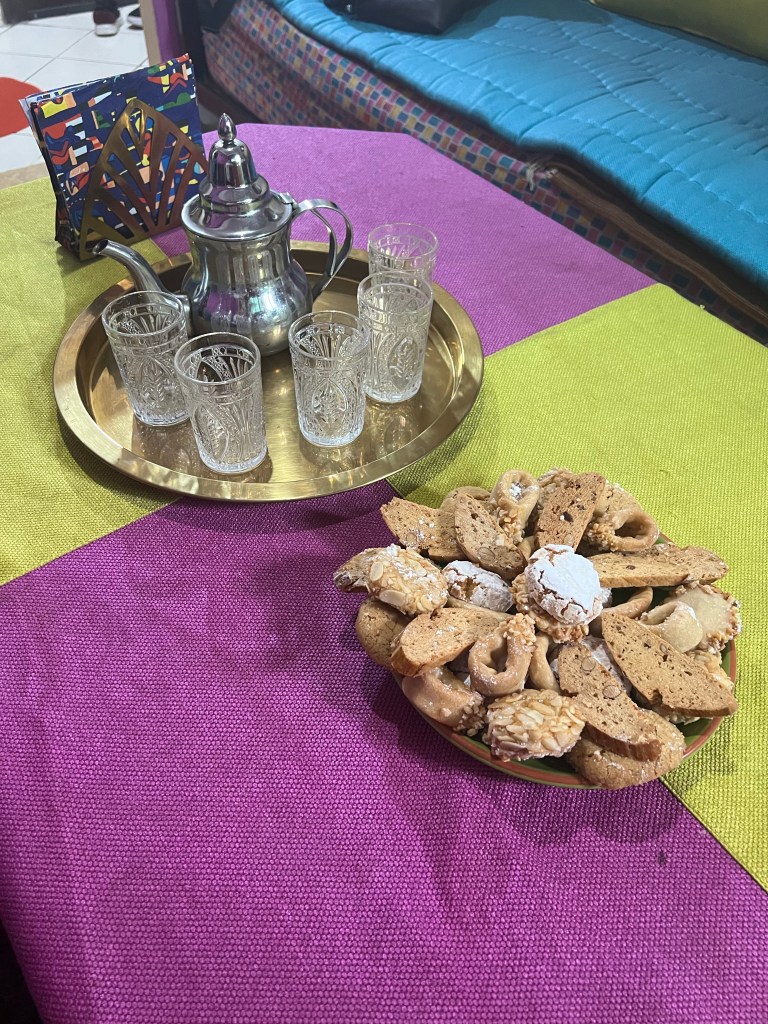 We had another fun activity planned for today: a cooking class! This was another experience that we had booked through Airbnb, so the class was held in our host Inas’s home. Inas welcomed us into her home where we met her brother Mohamed and their adorable cat Stormy. Their home was so beautifully decorated. We started the class by learning how to make Moroccan tea, which we enjoyed with a platter of sweets. Meanwhile, we chatted and got to know each other.