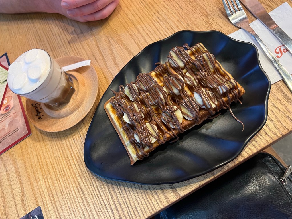 Carson and I went to a nearby cafe to get something to eat. I got a Nutella and banana waffle with a spiced white chocolate marshmallow drink, which tasted like a gingerbread hot chocolate. Since Carson had to work at 3:00 pm and it was pouring rain, we spent most of the rest of the day in the Airbnb.
