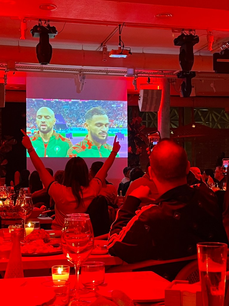 We were very excited for our dinner plans though! We had made reservations at a restaurant on the Marina Bay to watch Morocco play in the World Cup Semi-Finals. This is the first time Morocco, or any African country, has advanced to the semi-finals. How cool that we got to watch this game in Morocco! The Moroccan people were all so excited and proud of their country, so it was really special to be there for the game. The restaurant had pulled down a big projector screen that showed the game. We got dinner and drinks, which were really good, to eat throughout the game. Although Morocco didn’t win, it was really cool to be there to watch it! Everyone in the restaurant was so excited for their team. They stood up and sang during the national anthem. They cheered for their team throughout the game. And even when the game was over and they had lost, they still cheered for their team. We even heard people celebrating throughout the night. Morocco’s pride for their team is evident, and it was such a cool experience to be able to share that with them.