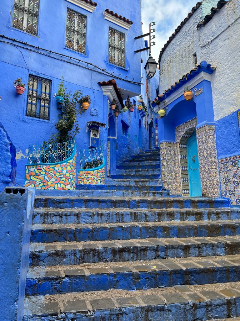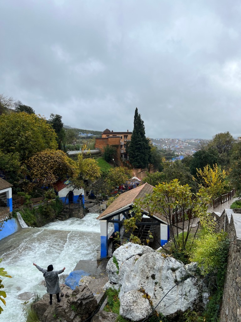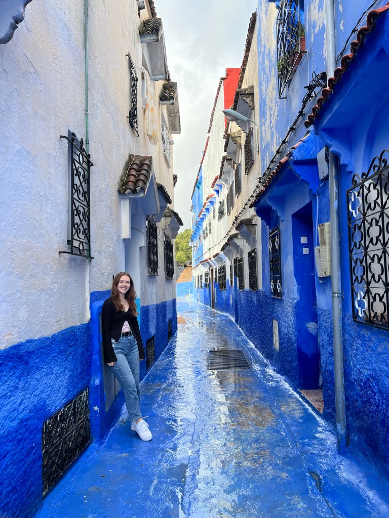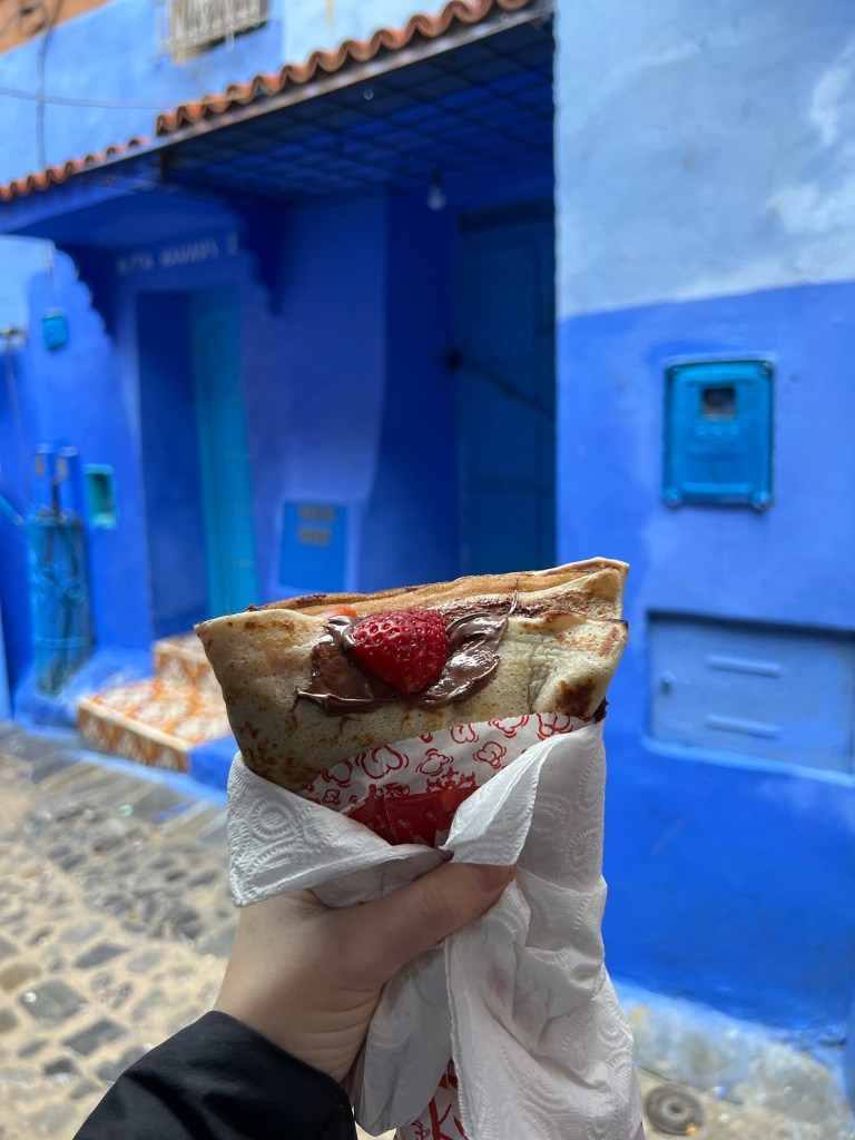 The Blue City is about a 2.5-3 hour drive each way. We took the 9:00 am bus and arrived in Chefchaouen just before noon. It was sprinkling on and off the whole time that we were there, but we didn’t mind. The main thing to do in Chefchaouen is wander around and admire all the blue buildings. The buildings are all so beautiful, and blue is my favorite color so I was in love! There are a couple stories to explain why the city is blue. One story is that the buildings were painted blue by the Jewish communities who fled to Morocco during WWII because blue is symbolic of the sky, heaven, and God. Another story says that the blue keeps the buildings cool in the warmer months and keeps the mosquitoes away. Regardless of which story is the truth, the locals take pride in their blue buildings and repaint them often to keep their color bright. We saw so many stray cats throughout the city that we loved. We hadn’t eaten breakfast that morning, but we didn’t have enough cash to eat a meal at any restaurants (we couldn’t find any places that accepted credit cards), so we rationed our cash for an afternoon treat. Mal and I each got a Nutella and strawberry crepe, and Martin got coffee. We hung out in a cafe for a while when the rain got too heavy. We walked to see a nearby waterfall at the edge of town, where locals sometimes do their washing – when it isn’t pouring rain, of course. We eventually walked back to the bus stop for our 3:30 pm bus back to Tangier.
